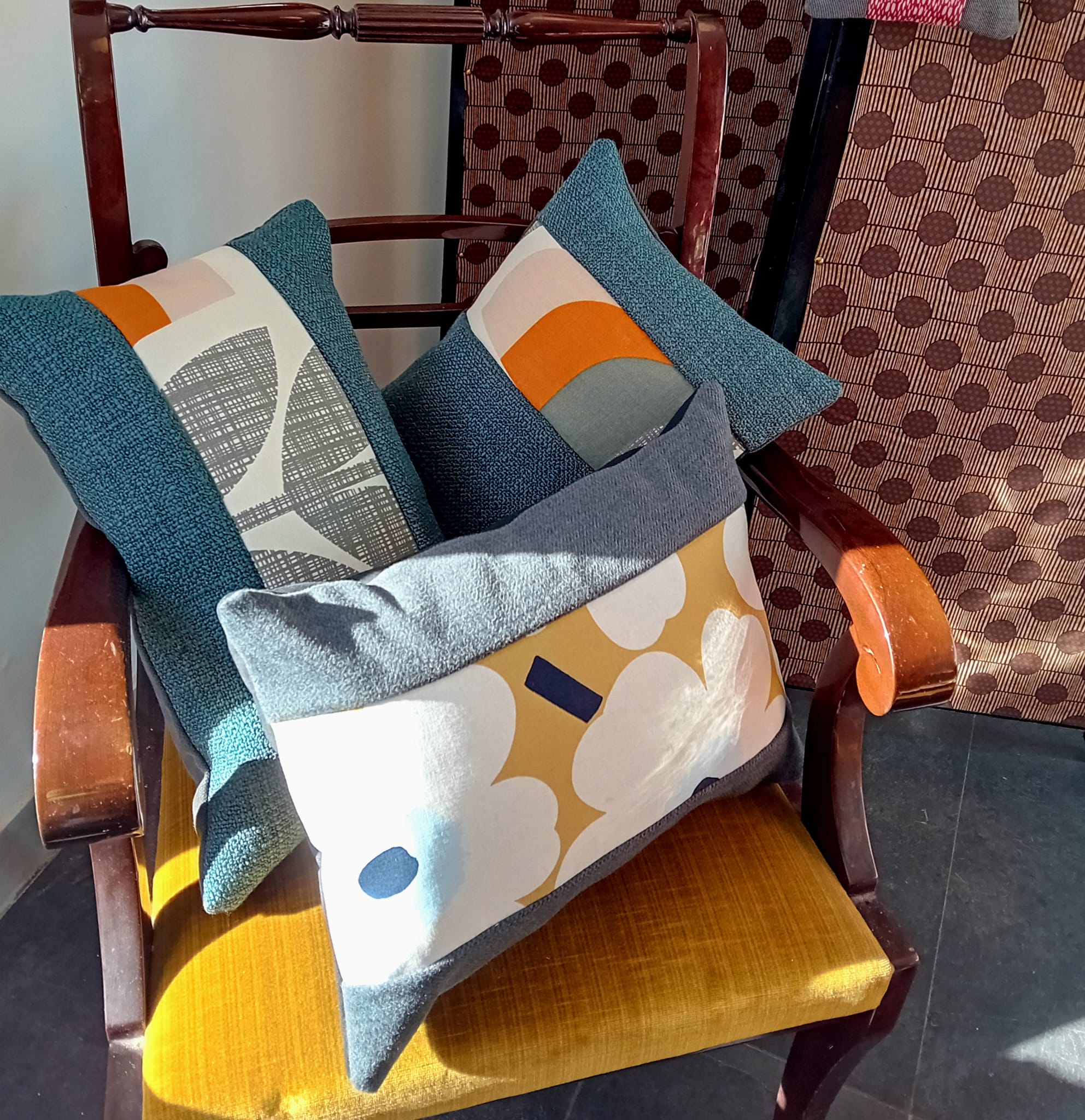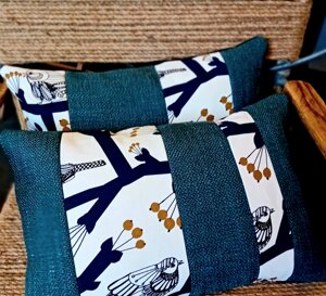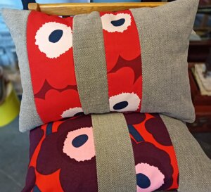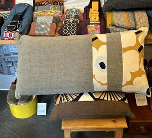 Di misure diverse, ma principalmente rettangolari. Realizzati in cotoni pesanti, misto lino e velluto. Inserti in coated cotton Marimekko e Orla Kiely. Completamente sfoderabili e lavabili, all'interno seconda federa imbottita in gommapiuma.