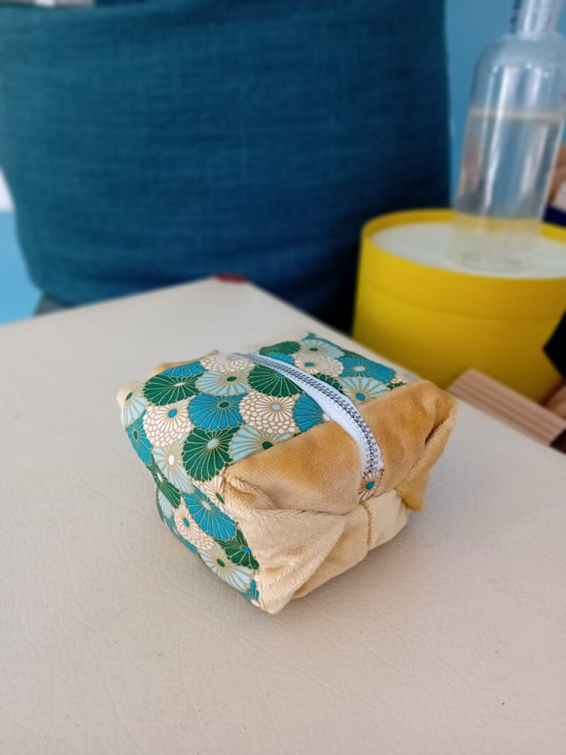 Piccolo beauty-case "cubotto", in velluto con inserto in cotone giapponese, zip e dettagli in metallo nichelato.