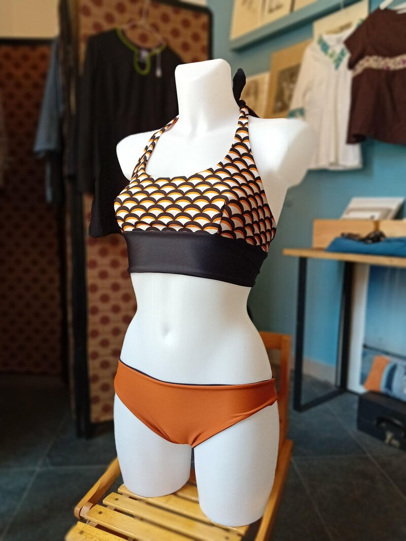 Bikini double face in morbida lycra con inserto a fantasia per un look sempre nuovo.