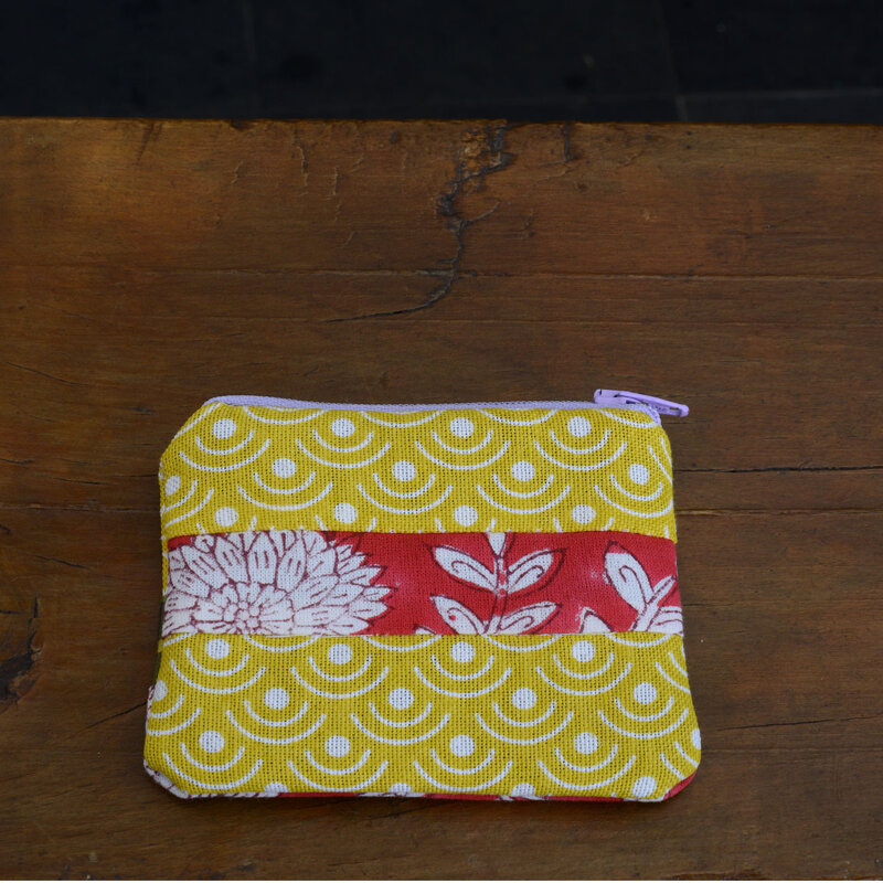 Piccolo borsellino in cotone pesante con zip e inserto in tessuto indiano.