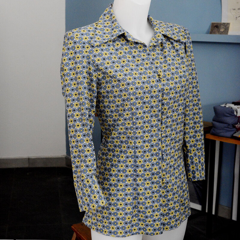 Camicia in puro cotone thailandese a fantasia, bottoni rivestiti in stoffa.