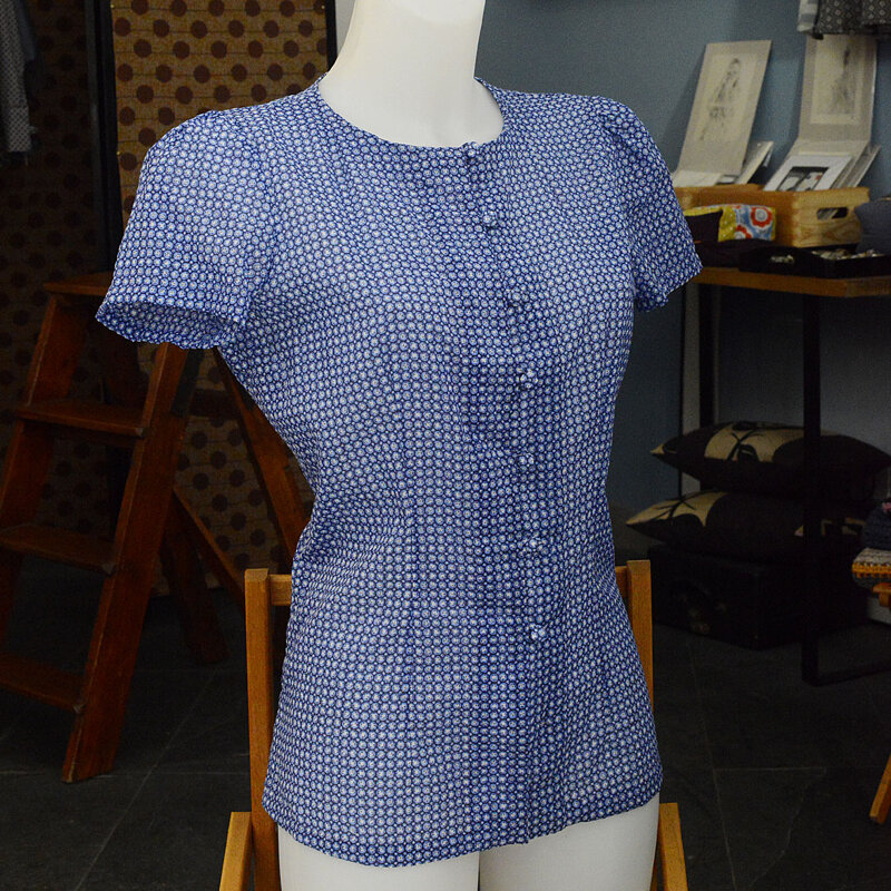 Camicia in cotone leggero a fantasia, bottoncini rivestiti in stoffa.