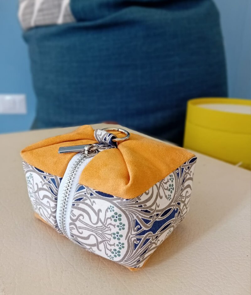 Beauty-case "cubotto", in alcantara con inserto in cotone inglese Liberty, zip e dettagli in metallo nichelato.