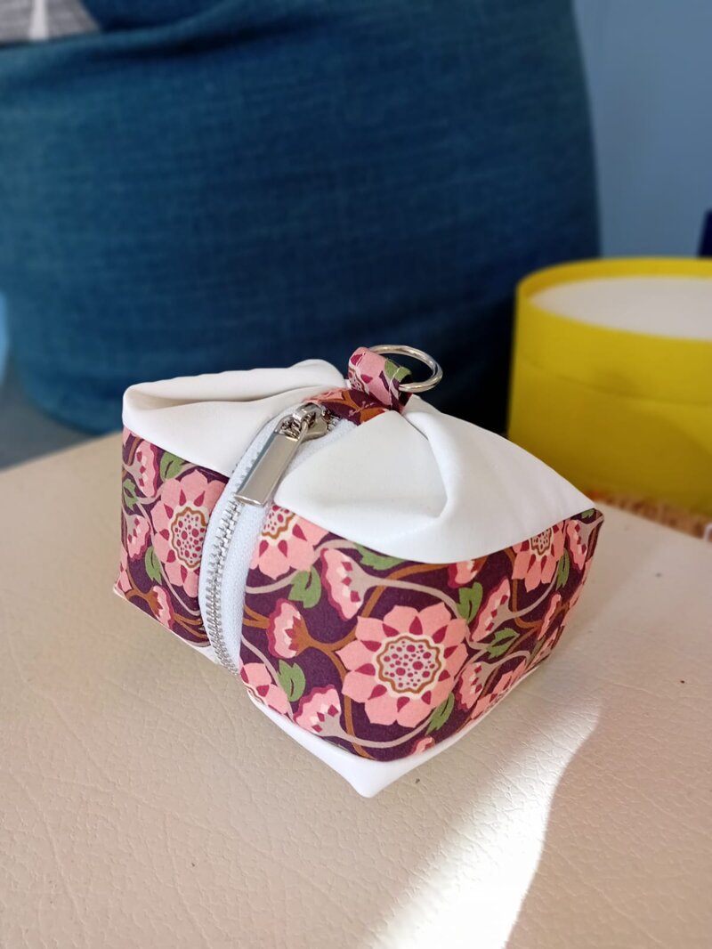 Beauty-case "cubotto", in ecopelle con inserto in cotone inglese Liberty, zip e dettagli in metallo nichelato.