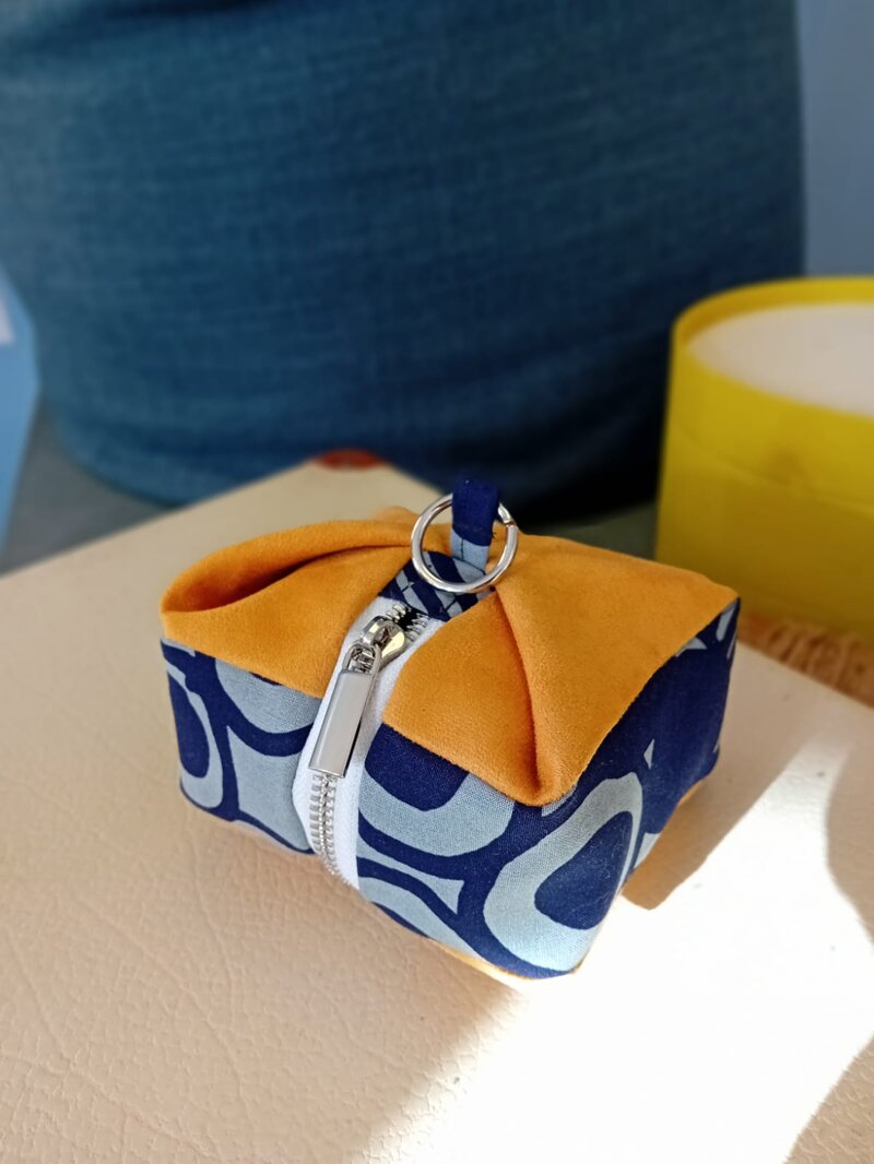 Beauty-case "cubotto", in alcantara con inserto in cotone della finlandese Marimekko, zip e dettagli in metallo nichelato.