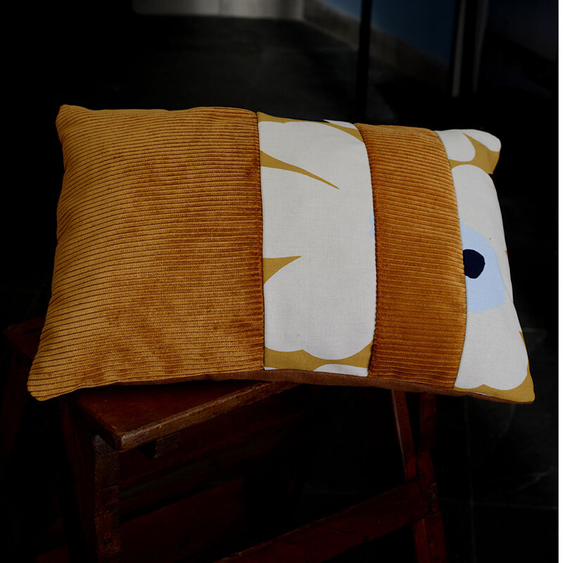 Cuscino sfoderabile in velluto a coste larghe con inserti in tessuto Marimekko. Interno in fiocchi di gommapiuma.