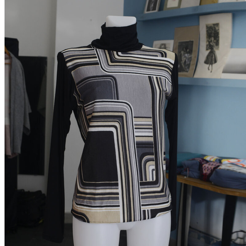 Dolcevita in morbida viscosa naturale. Leggermente avvitato, vestibilità mediamente aderente.