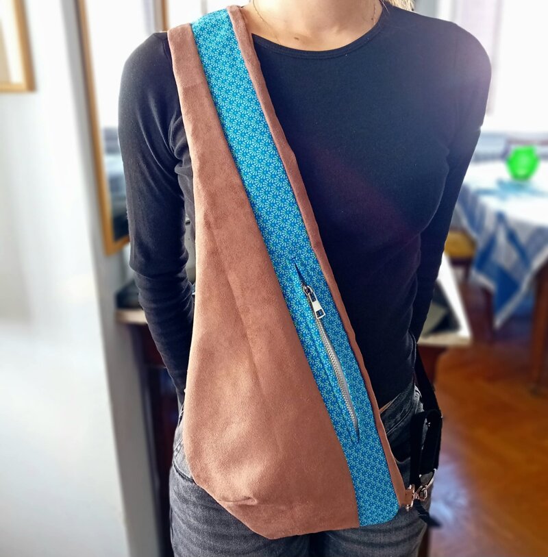 Borsa a tracolla in alcantara, con inserto in cotone francese Petit Pan. Zip e dettagli in metallo nichelato, cinghietto in nylon.