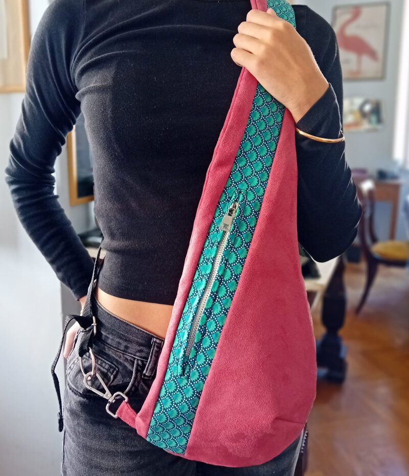 Borsa a tracolla in alcantara, con inserto in cotone francese Petit Pan. Zip e dettagli in metallo nichelato, cinghietto in nylon.