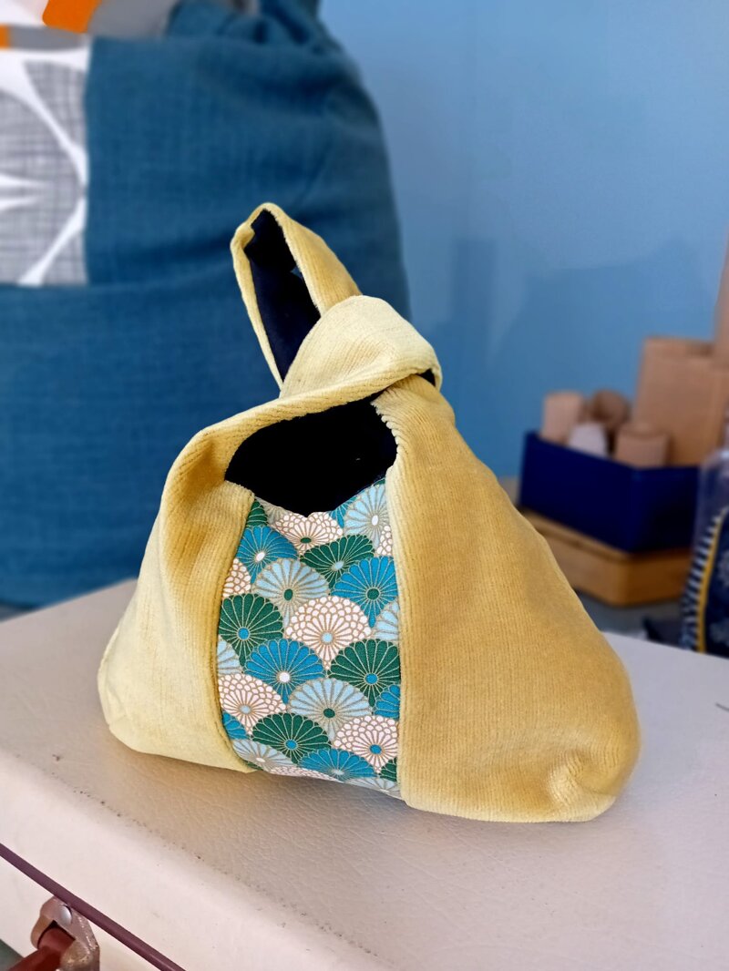 Borsetta in velluto giallo limone con inserto in cotone giapponese.