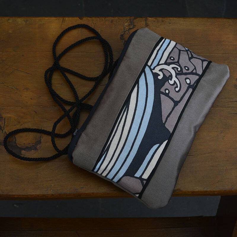Pochette in tessuto lucido, inserto in cotone giapponese, tracolla in cordino sottile a torchon.