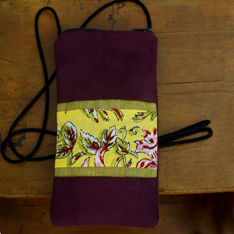 Portacellulare in alcantara bordeaux, inserto in cotone indiano, tracolla in cordino sottile a torchon.