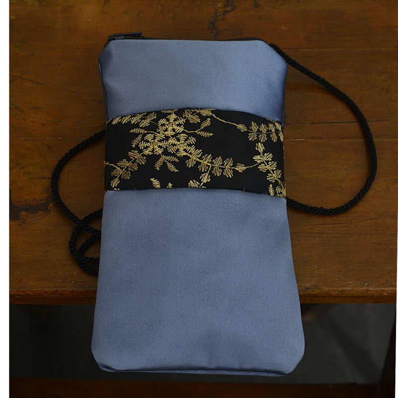 Portacellulare in tessuto tappezzeria, inserto in seta ricamato color oro, tracolla in cordino sottile a torchon.